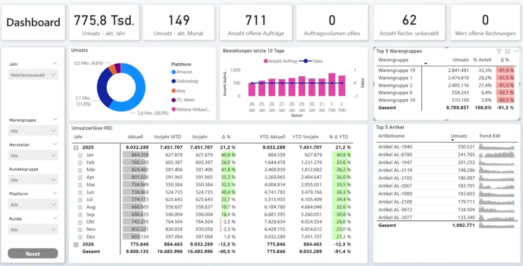 Unser BI‑Umsatzbericht liefert klare und sofort verständliche Auswertungen für Vertrieb, Einkauf und Geschäftsführung. Analysieren Sie Umsätze, Absätze, Kundenwert, Margen und Trends in wenigen Sekunden – statt Stunden. Perfekt für alle, die datenbasiert steuern und Wachstumspotenziale gezielt nutzen möchten.