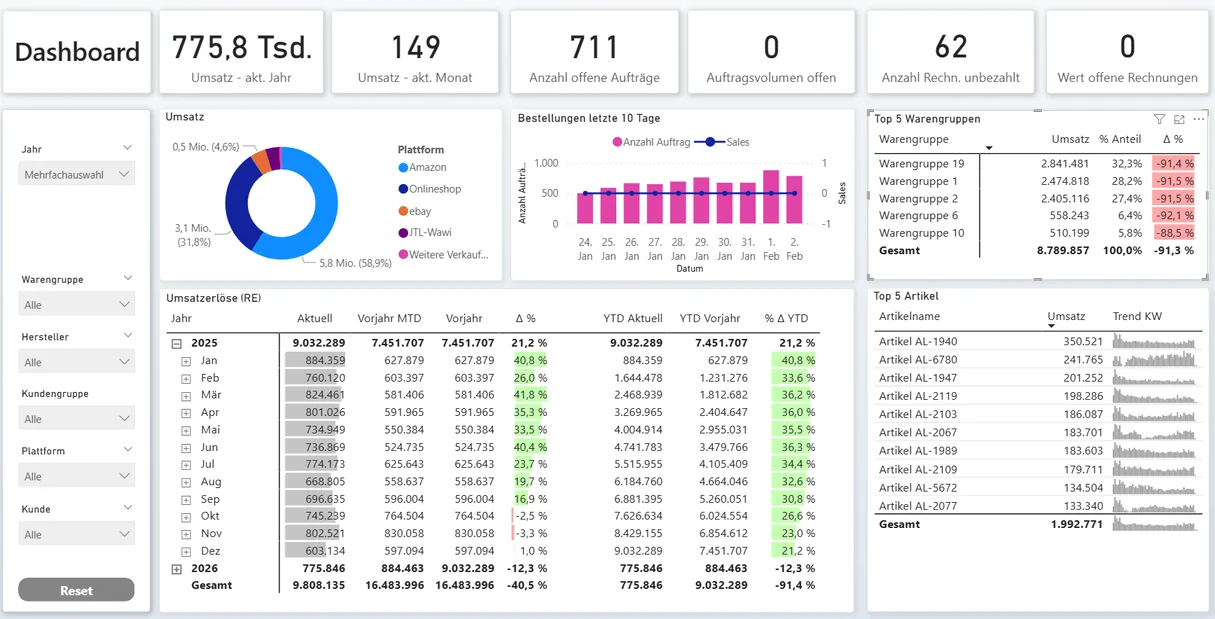 Wir verbinden BI‑Expertise, Datenmodellierung und tiefes JTL‑Know-how. Unser Team hat das Data Warehouse sowie alle BI-Berichte vollständig selbst entwickelt – für maximale Performance, Skalierbarkeit und Zukunftssicherheit.