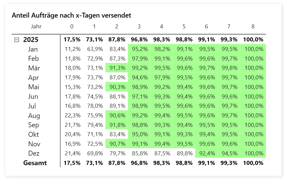 Kumulierte Ansicht: Sehen Sie sofort, wie viel Prozent Ihrer Aufträge das Ziel in X Tagen das Lager verlassen.