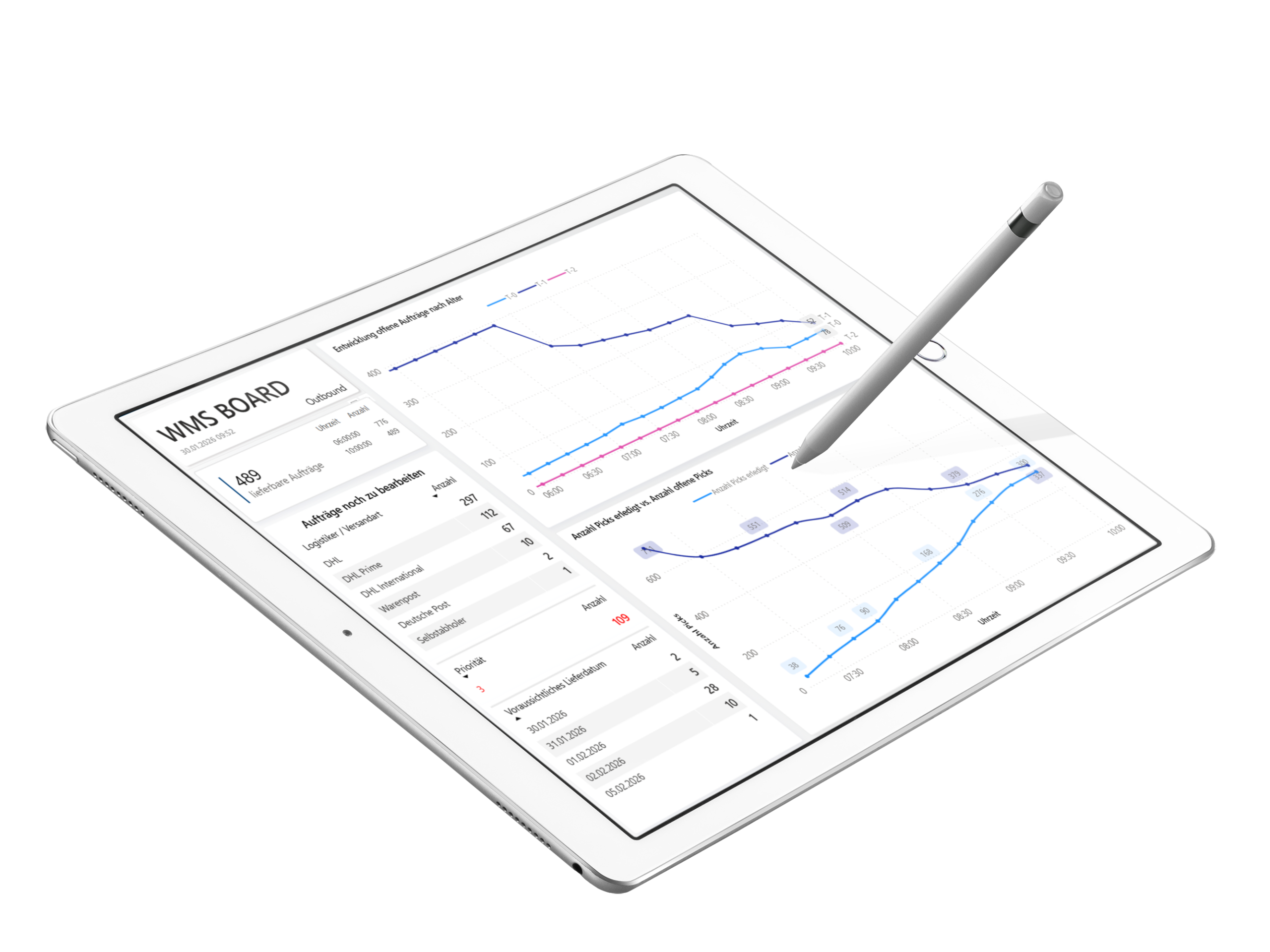 Das WMS-BOARD stellt viele wichtige Kennzahlen für einen schnellen Überblick bereit und bietet Ihnen folgende Vorteile:
